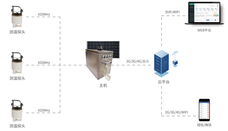 當(dāng)測(cè)溫傳感器實(shí)時(shí)采集到監(jiān)測(cè)點(diǎn)的溫度數(shù)據(jù)時(shí),這些數(shù)據(jù)會(huì)迅速上傳至主機(jī),并通過物聯(lián)網(wǎng)卡傳輸至云平臺(tái)。用戶只需通過Web平臺(tái)或微信公眾號(hào),就能隨時(shí)隨地查看線路溫度情況。一旦溫度異常,系統(tǒng)不僅會(huì)立即在平臺(tái)上顯示告警信息,還會(huì)通過短信將告警內(nèi)容發(fā)送到用戶手機(jī),確保問題得到及時(shí)處理。