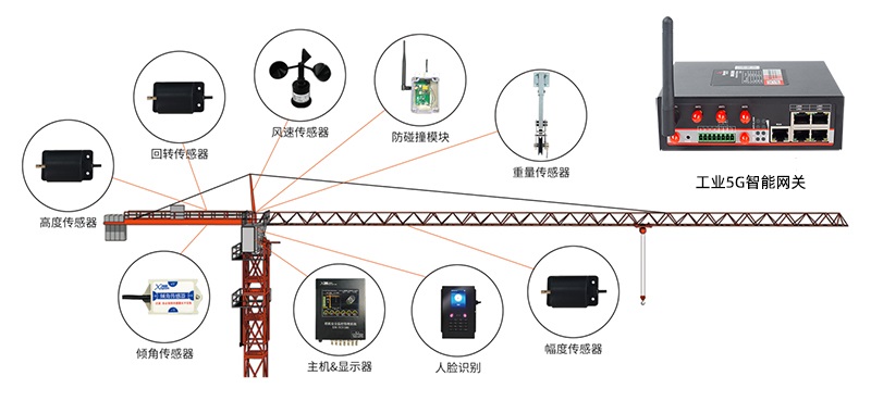 塔吊是建筑施工中必不可少的設(shè)施,由于塔吊工作重心高、起重載荷大、人工視距/視角受限等因素,也使得塔吊在工作過程中著較多的危險因素。對此,可以部署基于工業(yè)5G智能網(wǎng)關(guān)+物聯(lián)網(wǎng)卡搭建智慧塔吊安全監(jiān)測系統(tǒng),實(shí)現(xiàn)對塔吊運(yùn)行的全局精細(xì)監(jiān)測感知、智能控制和風(fēng)險防范等,從而提高塔吊施工的總體效率和安全性。