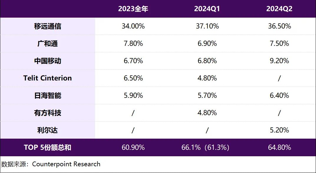 為此,我們總結(jié)了2023全年、2024年第一季度及第二季度蜂窩物聯(lián)網(wǎng)模組企業(yè)全球TOP5的份額數(shù)據(jù),如下: