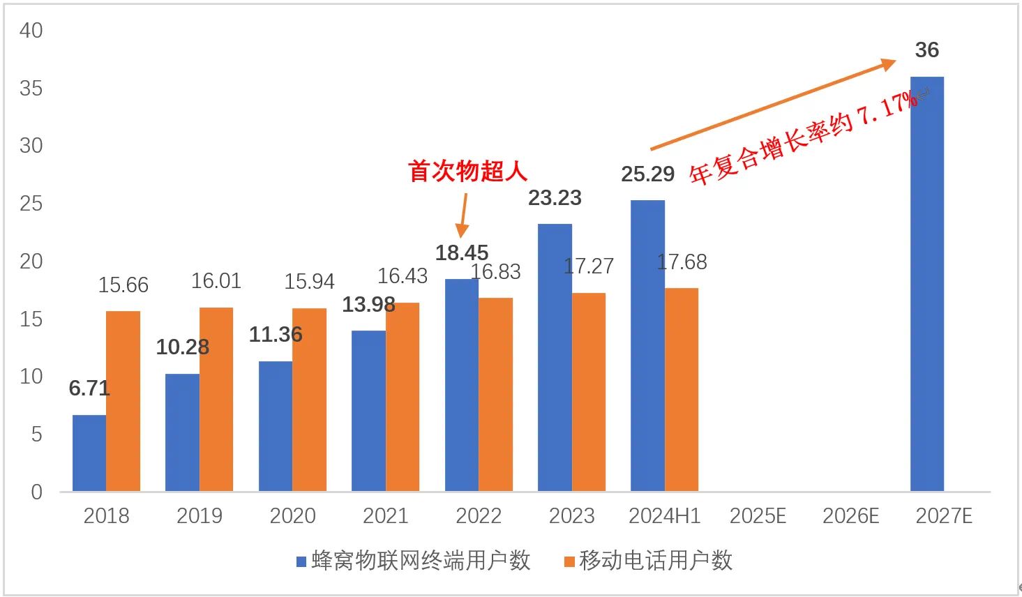 根據(jù)2024年9月工信部《關(guān)于推進(jìn)移動(dòng)物聯(lián)網(wǎng)“萬物智聯(lián)”發(fā)展的通知》,計(jì)劃到2027年底,國內(nèi)移動(dòng)物聯(lián)網(wǎng)終端連接數(shù)突破36億。相較于2023年蜂窩物聯(lián)網(wǎng)連接數(shù)為23.23億,需要該段時(shí)間蜂窩物聯(lián)網(wǎng)連接數(shù)的年復(fù)合增長率約7.17%。