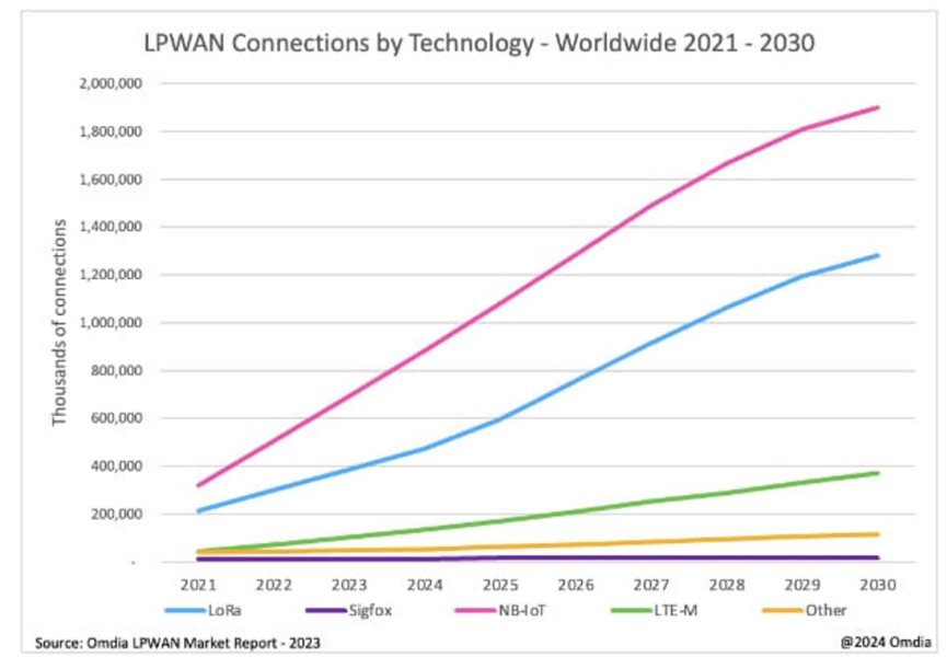 今年6月,市場研究機構(gòu)發(fā)布報告顯示,低功耗廣域網(wǎng) (LPWAN) 連接領(lǐng)域以 NB-IoT 和 LoRa 為主導(dǎo),2023 年這兩種技術(shù)合計占總連接的 87%。這種主導(dǎo)地位將持續(xù)下去,預(yù)計到 2030 年,這兩種技術(shù)將占據(jù)所有 LPWAN 連接的 86%。