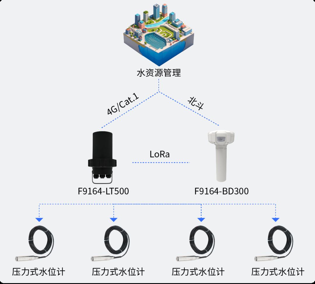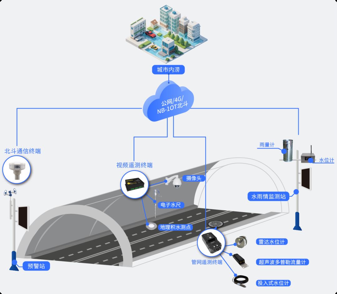 城市內(nèi)澇積水監(jiān)測方面,為解決隧道或低洼區(qū)信號通信不穩(wěn)定、設備線纜部署困難等問題,采用地埋式水位計與網(wǎng)關(guān)進行LoRa組網(wǎng),再通過4G+北斗雙鏈路數(shù)據(jù)通信,實時監(jiān)測積水深度、水位變化等數(shù)據(jù),保證通信穩(wěn)定性,一旦發(fā)現(xiàn)異常及時發(fā)布預警信息。
