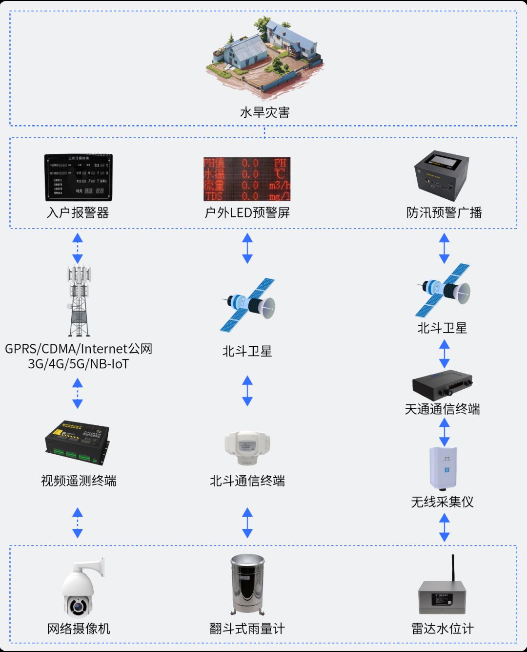 四信北斗產(chǎn)品采用北斗三代通信技術(shù),作為4G/5G通信的備份信道,在無人區(qū)、弱信號、無公網(wǎng)等地區(qū)或突發(fā)災害情況下,可以利用北斗衛(wèi)星網(wǎng)絡實時在線監(jiān)測區(qū)域降雨量、河道水位流量、地質(zhì)災變、內(nèi)澇積水等數(shù)據(jù)信息及設備的運行狀態(tài),并及時回傳至監(jiān)管平臺,根據(jù)數(shù)據(jù)分析結(jié)果及時準確發(fā)布預警信息,為災害預警、預報和救災指揮調(diào)度提供科學依據(jù)。