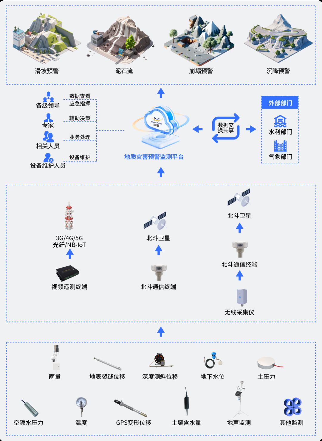 在地質(zhì)災害監(jiān)測預警方面,采用4G/5G移動通信為主,北斗三代通信為輔的雙信道方式,在公網(wǎng)中斷、地面網(wǎng)絡信號較弱等情況下,對崩塌、滑坡、泥石流等主要地質(zhì)災害類型進行實時自動化監(jiān)測,獲取巖體位移、土體傾斜、降雨量等多種災變數(shù)據(jù),對整個地質(zhì)災害的產(chǎn)生和演變過程實現(xiàn)遠程實時監(jiān)測、自動預警,提高災害應變能力。
