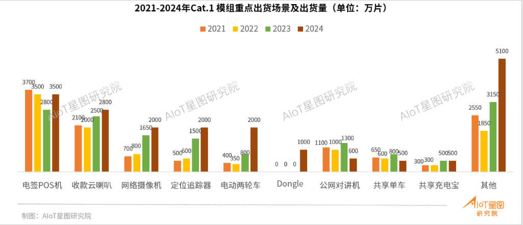 2021-2024年Cat.1模組重點出貨場景及出貨量: