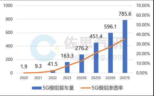 2023-2027年中國乘用車5G模組裝車量及滲透率