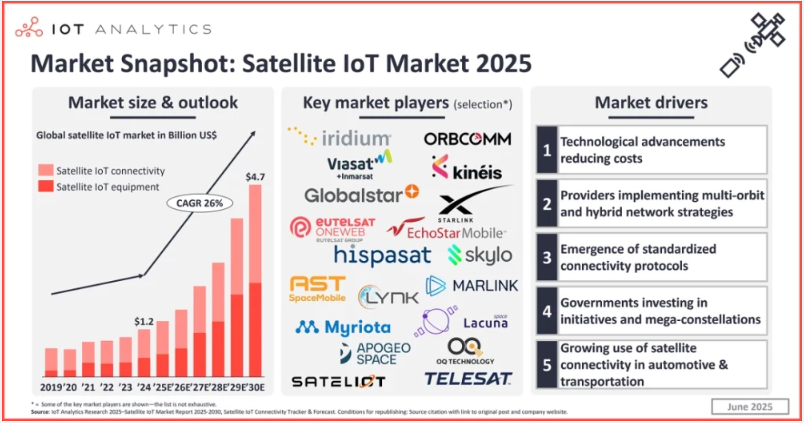 根據(jù)知名物聯(lián)網(wǎng)產(chǎn)業(yè)研究機構 IoT Analytics 于 2025 年 6 月最新發(fā)布的《2025–2030 年衛(wèi)星物聯(lián)網(wǎng)市場報告》,2024 年全球衛(wèi)星物聯(lián)網(wǎng)連接數(shù)已達 750 萬。IoT Analytics 預測,衛(wèi)星物聯(lián)網(wǎng)連接數(shù)還將持續(xù)強勁增長,帶動衛(wèi)星網(wǎng)絡運營商(SNO)與設備供應商的綜合收入以 26% 的年復合增長率(CAGR)增長,至 2030 年市場規(guī)模將超過 47 億美元。