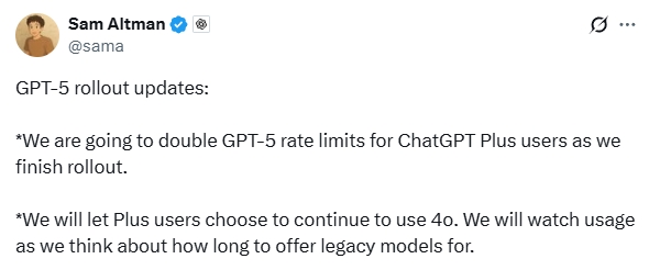 OpenAI首席執(zhí)行官Sam Altman于周五迅速做出回應(yīng):將允許Plus用戶選擇繼續(xù)使用前代版本的GPT-4o。