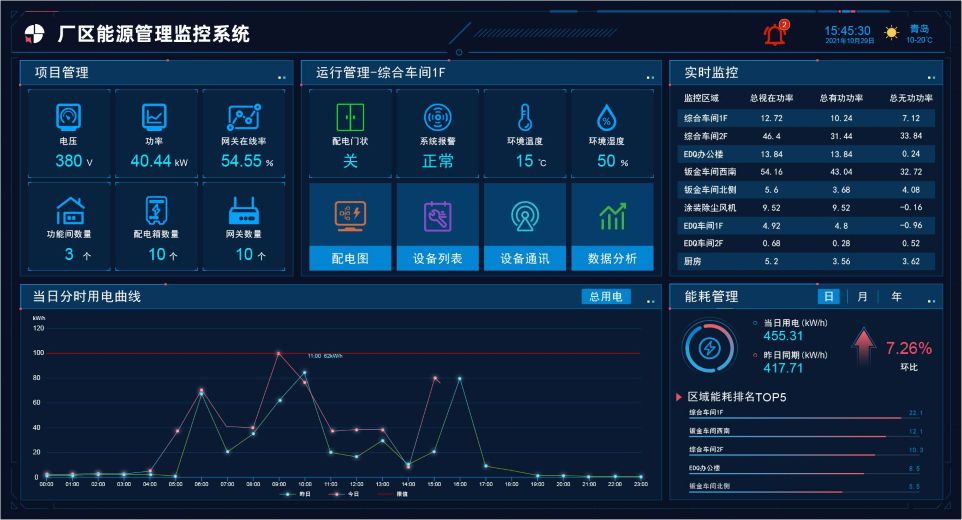 能耗分析可視化:云端平臺生成能耗報表(日報 / 周報 / 月報)、能耗熱力圖(車間能耗分布)、設(shè)備能耗排行榜,支持按能源類型、時間段、車間維度查詢,能源管理員可直觀識別節(jié)能空間(如某生產(chǎn)線能耗是同類線的 1.2 倍)。