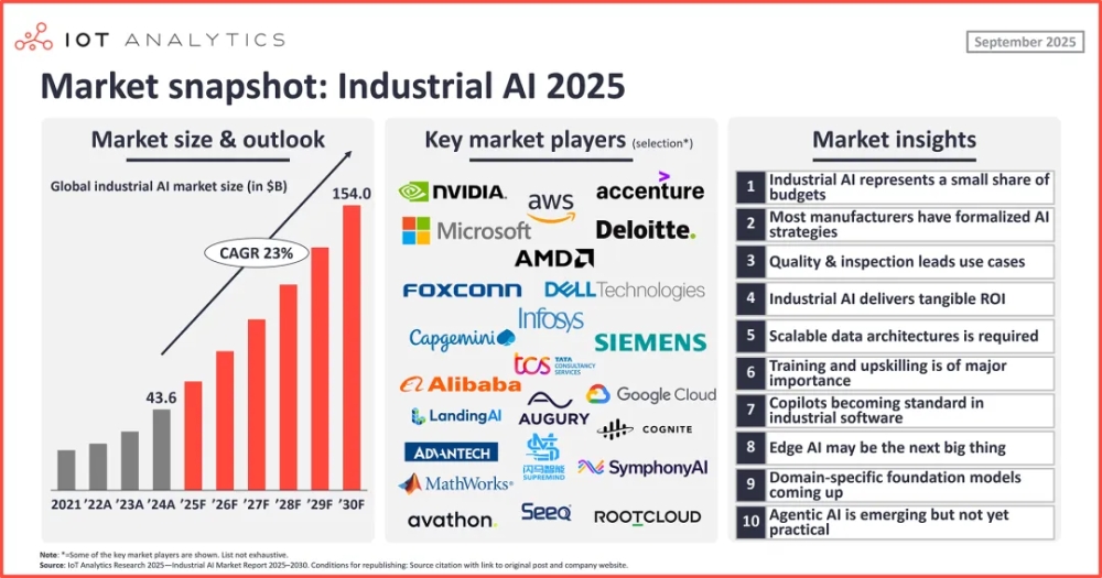 根據(jù)IoT Analytics調(diào)研報(bào)告顯示,2021年,絕大多數(shù)制造企業(yè)還在將工業(yè)AI視為“實(shí)驗(yàn)項(xiàng)目”或“輔助工具”。但到了2025年,工業(yè)AI已經(jīng)被寫入企業(yè)路線圖,成為董事會(huì)和CEO在財(cái)報(bào)季反復(fù)討論的關(guān)鍵議題。