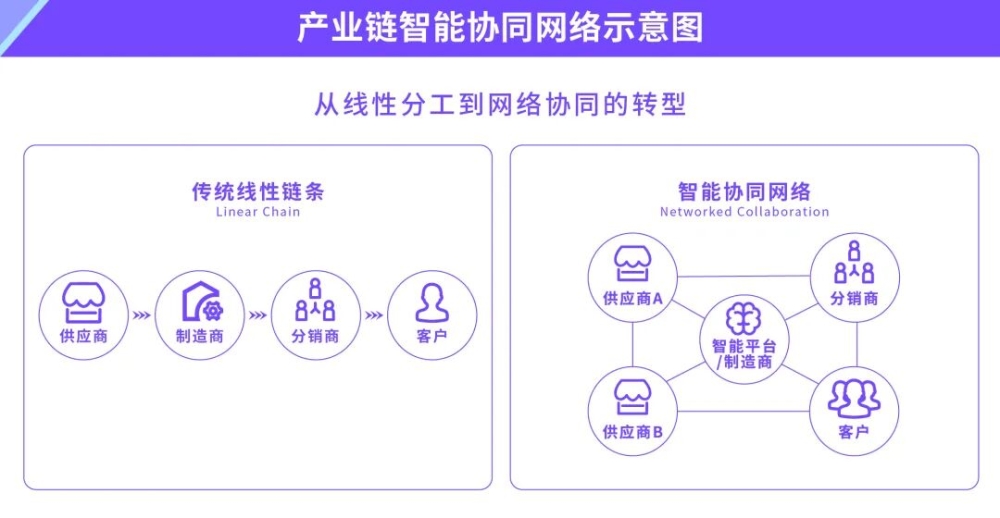這種改變,不只是管理流程的升級(jí)、局部環(huán)節(jié)的智能化,而是對(duì)產(chǎn)業(yè)鏈組織方式、價(jià)值分配模式、企業(yè)間協(xié)同機(jī)制的根本性重構(gòu),甚至延展到供應(yīng)鏈網(wǎng)絡(luò)的全面重組,以及制造企業(yè)從“產(chǎn)品導(dǎo)向”到“服務(wù)導(dǎo)向”的商業(yè)模式創(chuàng)新。
